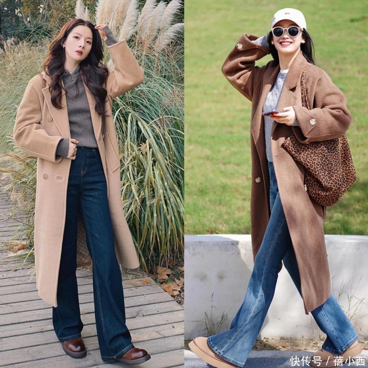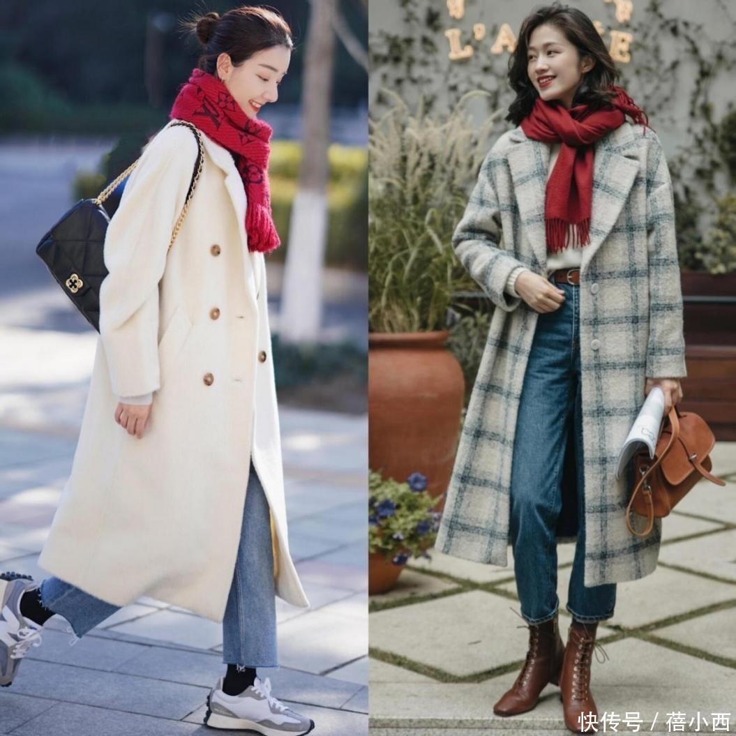 先来看左边,这身穿搭走的是温柔简约路线。白色大衣版型宽松,双排扣设计让层次感变得更强;垂坠感十足的面料自带高级时尚感。腿上牛仔裤看着像八分裤,脚踝直接露在外边。脖子的红色围巾太醒目了,让穿着者无法再低调。右边这身穿搭更显活泼气质。格纹大衣自带英伦范儿,格子有大有小,它们的存在让整体造型多了几分俏皮感。脚上是一双短靴,牛仔裤的裤脚刚好与靴筒衔接,散发出浓浓的复古气息。