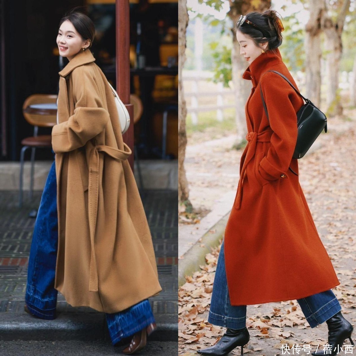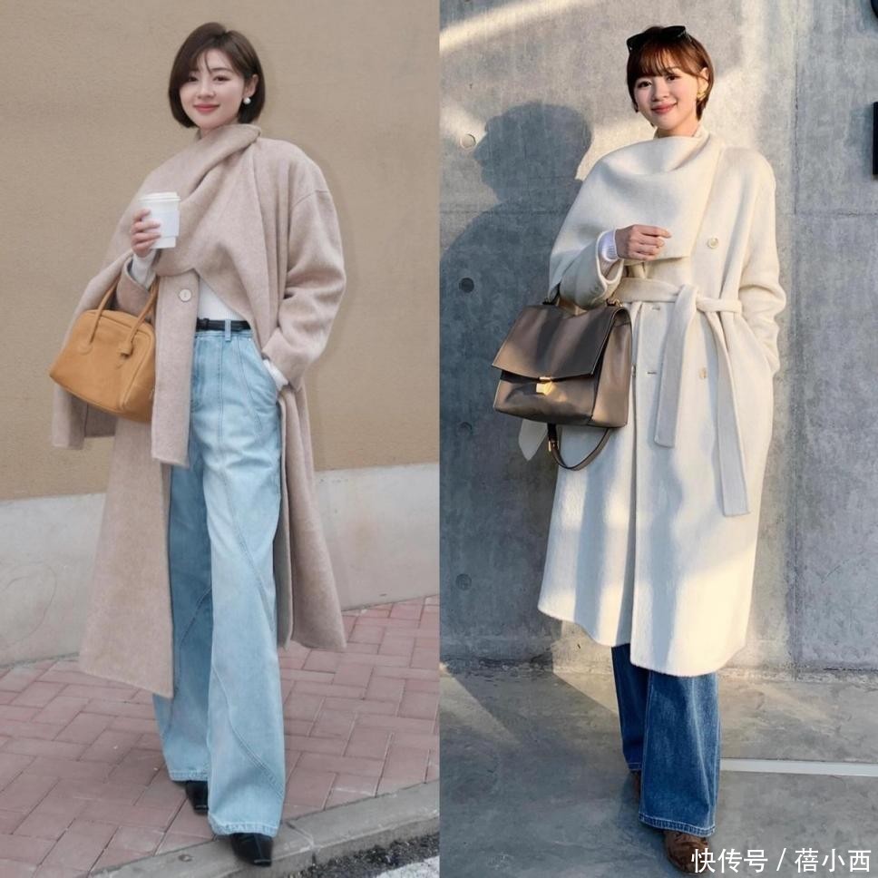 燕麦色大衣与黑大衣一样,适穿人群都很广。腿上是浅蓝色阔腿牛仔裤,裤脚微微堆积在小皮鞋上,给人随性慵懒之感。白色大衣自带高冷感,版型宽松的同时腰部配有同色腰带,随便一系就让身材比例更加优越。深蓝色牛仔裤的出现给了人惊喜,其不仅平衡了色彩,也给整体穿搭增添了复古感。