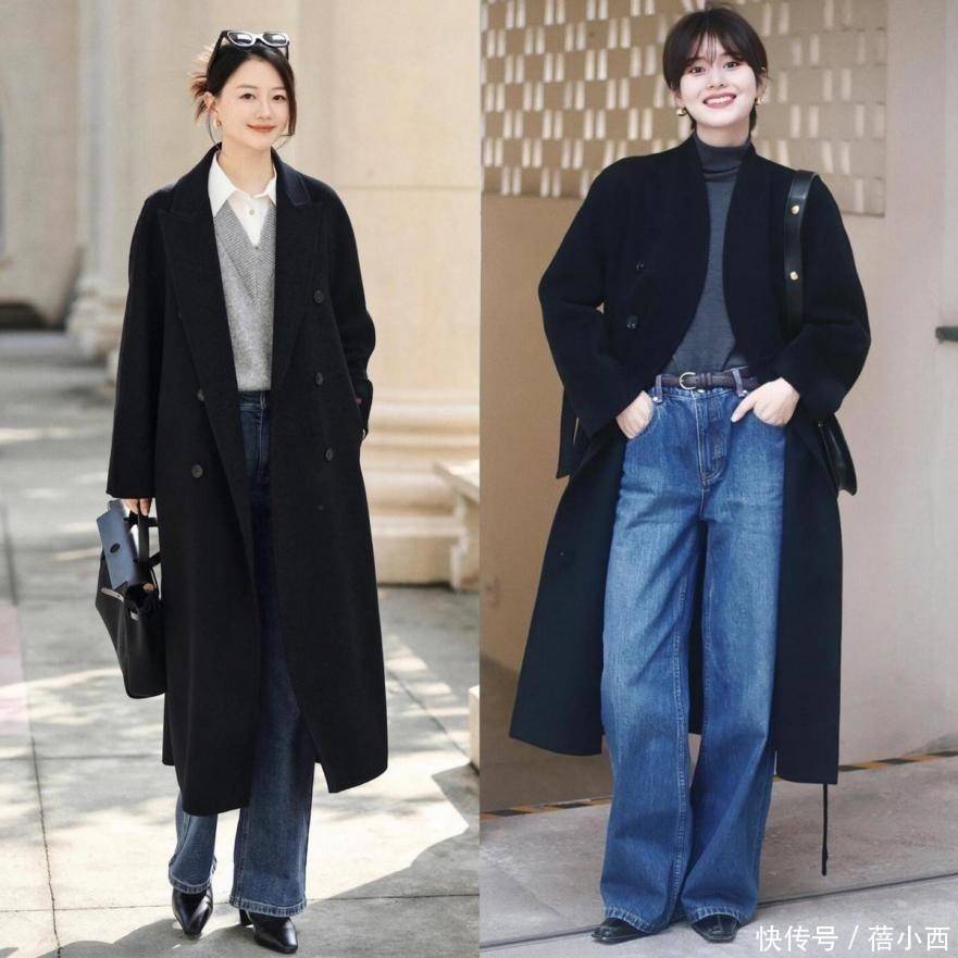 中长款黑大衣流行度极其高,此色优缺点皆有。先来说好的一面,就是衬肤色,不挑穿着者;不好的一面是,这种黑色面料在比较爱粘土,穿的时候脱落的头发也容易粘在上边。当大衣长度在脚踝之上时,会让穿着者拥有走路带风的松弛感。大衣敞开穿时,内搭便藏不住了。生活中,我们在搭配时,里边可以试试高领打底衫,或者在衬衫之上搭背心。穿直筒牛仔裤时,脚上可试试尖头皮鞋。